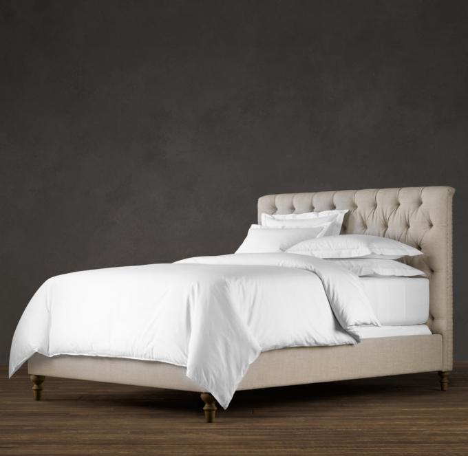 Now, I just needed a bed frame. I didn't want a skirt over a metal frame. I have been dreaming of a tufted fabric headboard. I love the platform beds where the rails are covered in fabric too, like this: